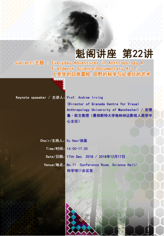 为拓展师生们的研究视角,丰富大家的人类学田野素材获取途径和方法, 邀请英国曼彻斯特大学下辖格林纳达影视人类学中心主任安德鲁·欧文教授(Professor Andrew Irving)于2018年12月17日下午14:00在云南大学东陆校区科学馆二楼第11会议室举行了题为“人类学的日常冒险:田野的科学与纪录片的艺术”的精彩讲座。